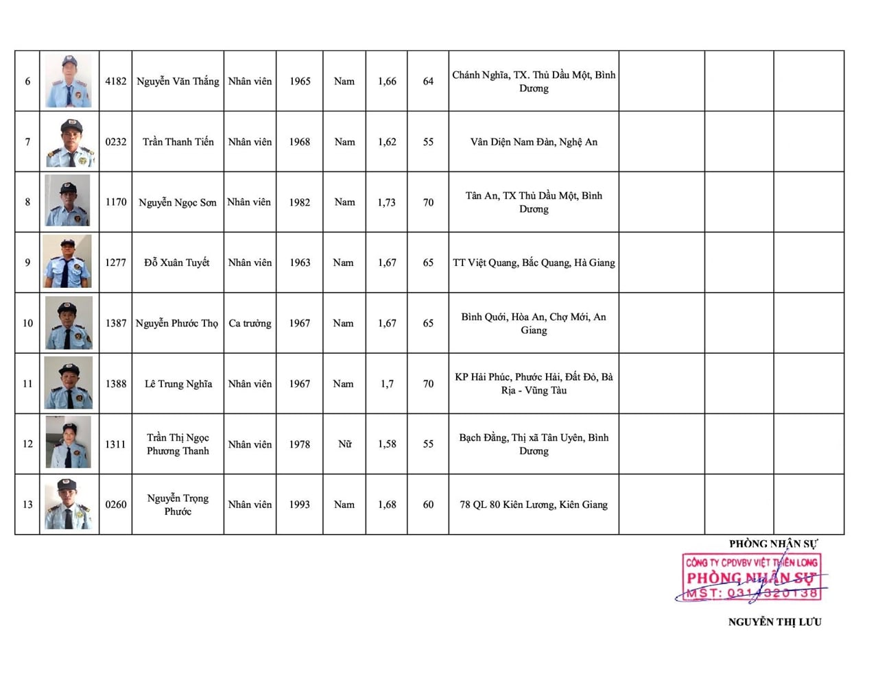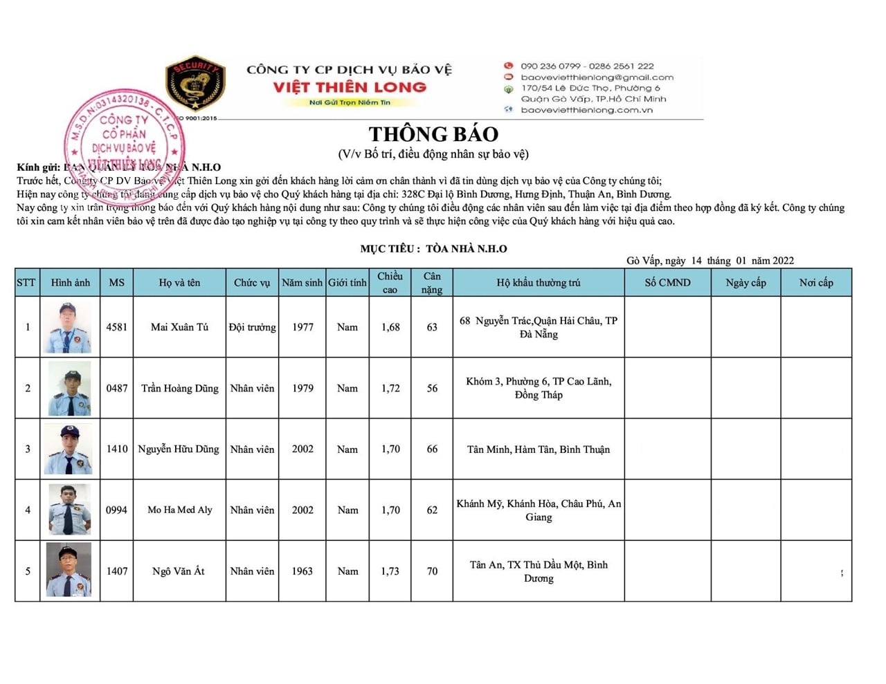 DANH SÁCH NHÂN SỰ ĐỘI AN NINH 14.01.2022