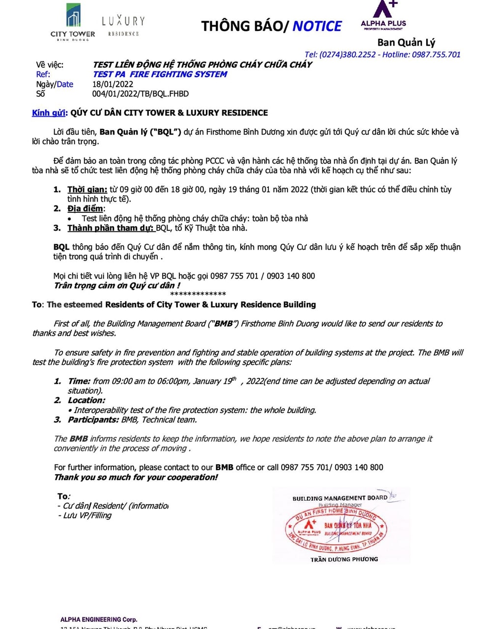 TEST LIÊN ĐỘNG HỆ THỐNG PHÒNG CHÁY CHỮA CHÁY 19.01.2022