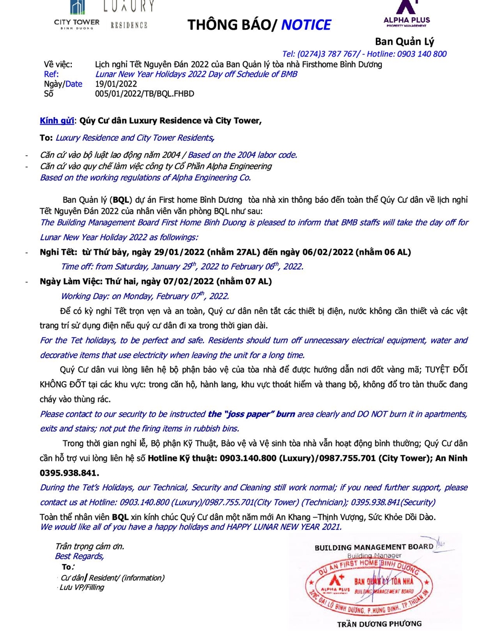 Lịch nghỉ Tết Nguyên Đán 2022 của Ban Quản lý tòa nhà