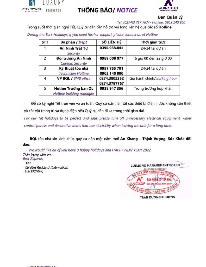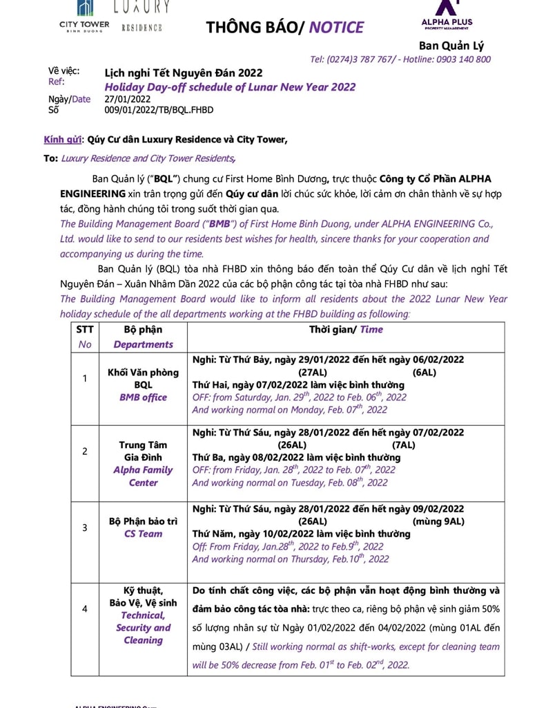 Lịch nghỉ Tết Nguyên Đán 2022 của các bộ phận tại chung cư FHBD năm 2022