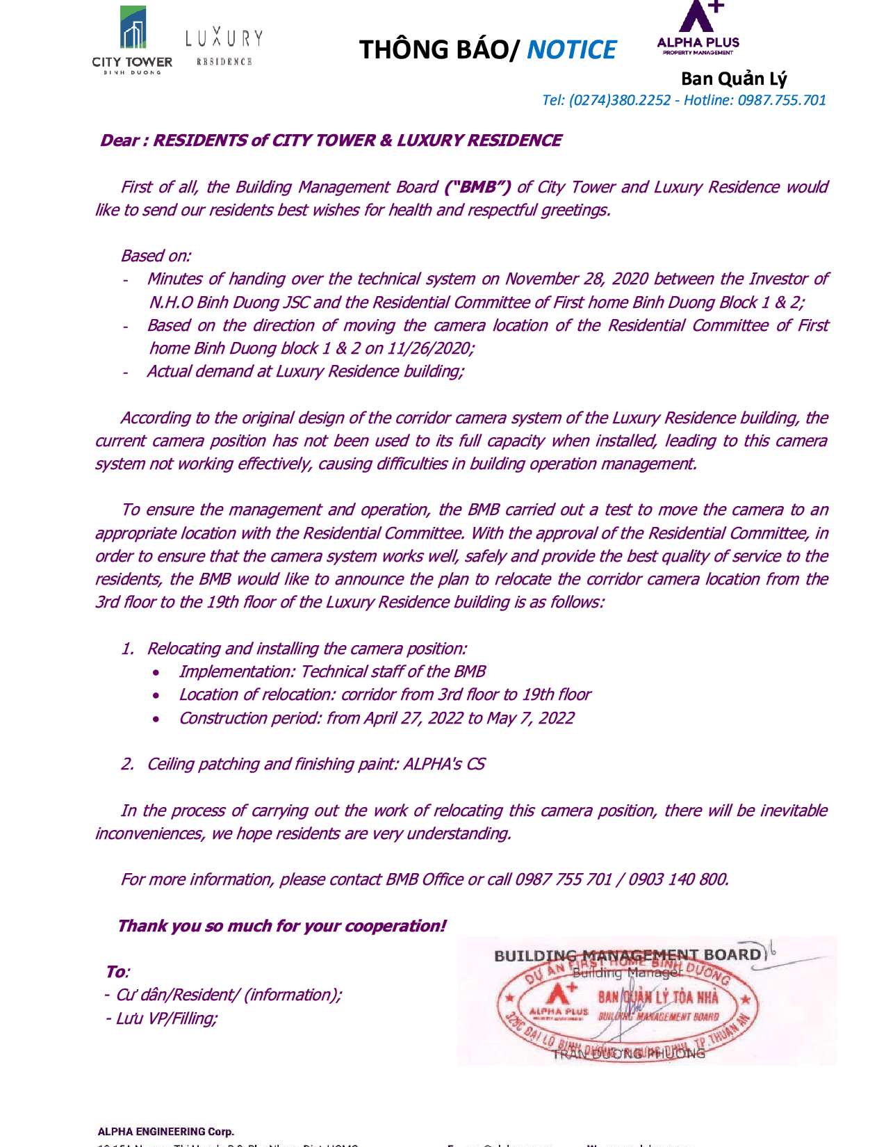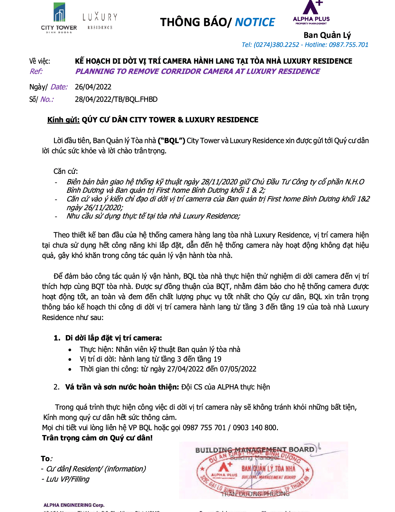 Kế hoạch di dời vị trí camera hành lang Luxury Residence