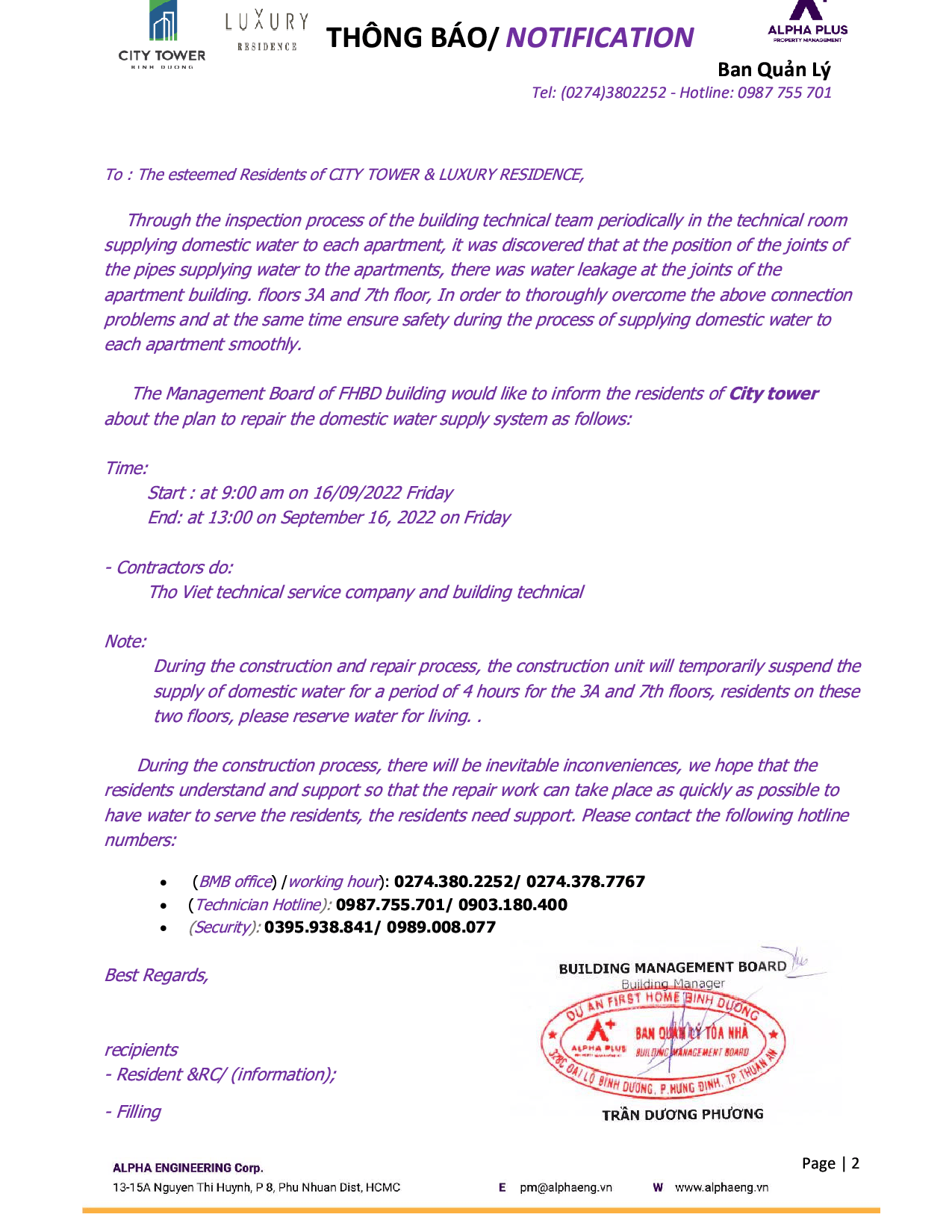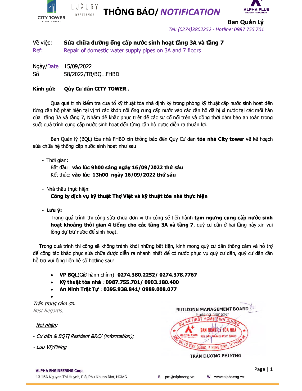 Sửa chữa đường ống cấp nước sinh hoạt tầng 3A và tầng 7
